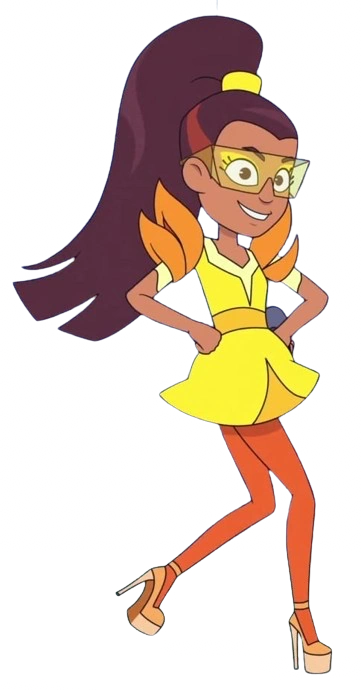 Kelci has a very similar appearance to Hailey Banks. She has tan skin and long brown hair that she usually ties up in a high ponytail with a yellow tie. Her stage outfit consists of a yellow dress with orange cut wing-shaped sleeves and orange tights She also wears yellow eyeshadow and a pair of translucent yellow glasses on stage.